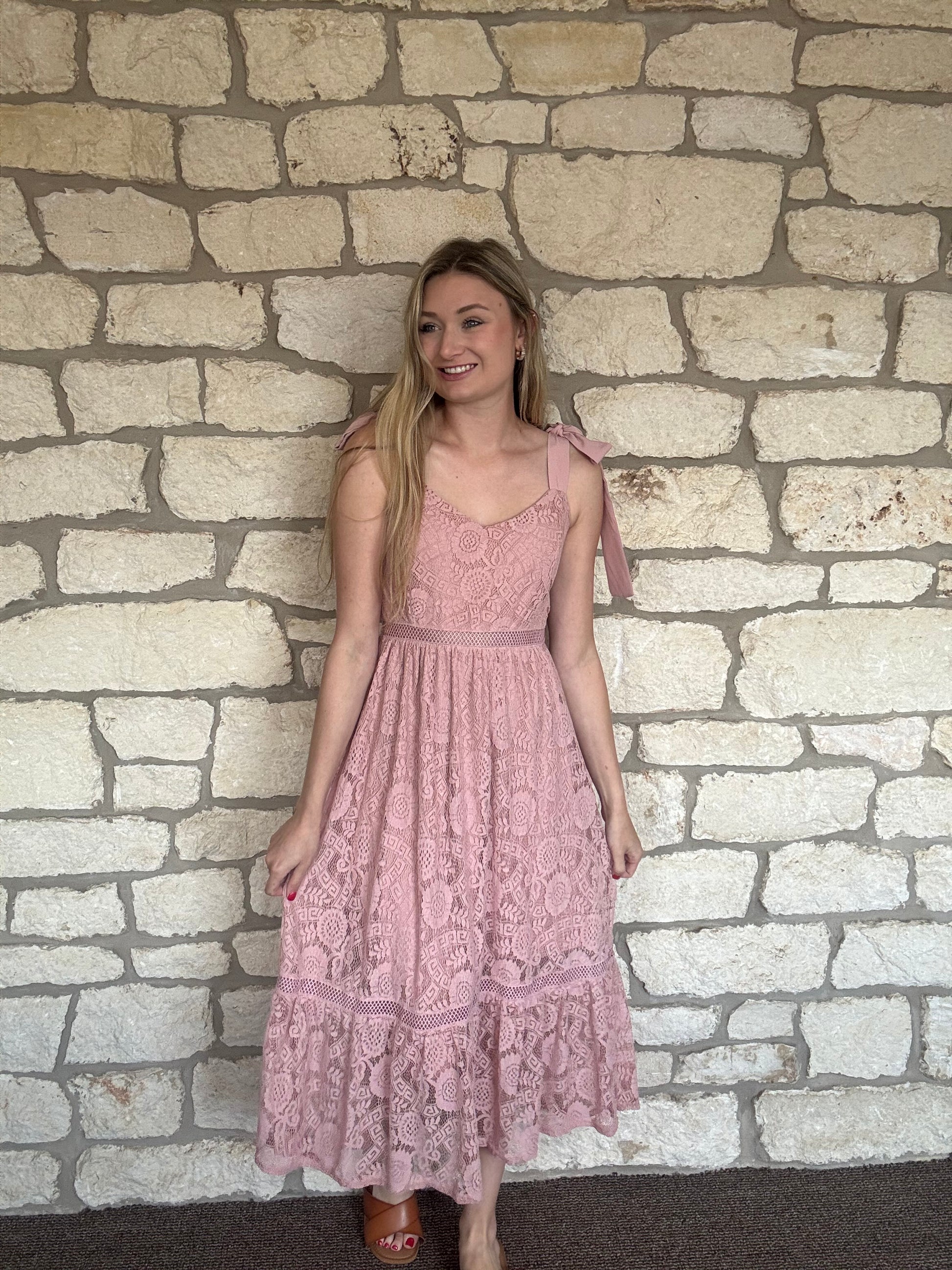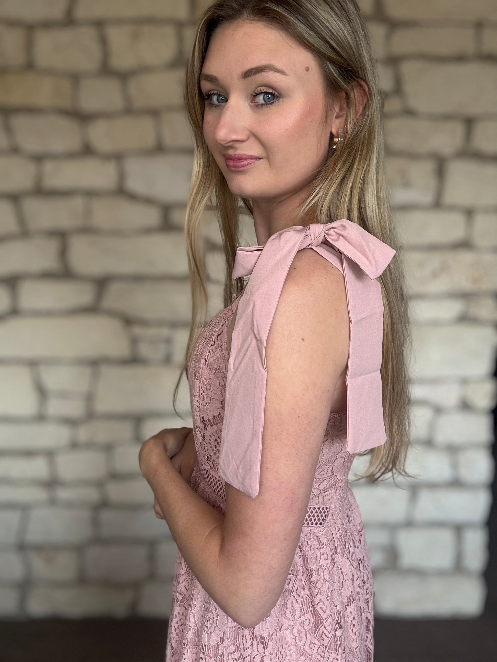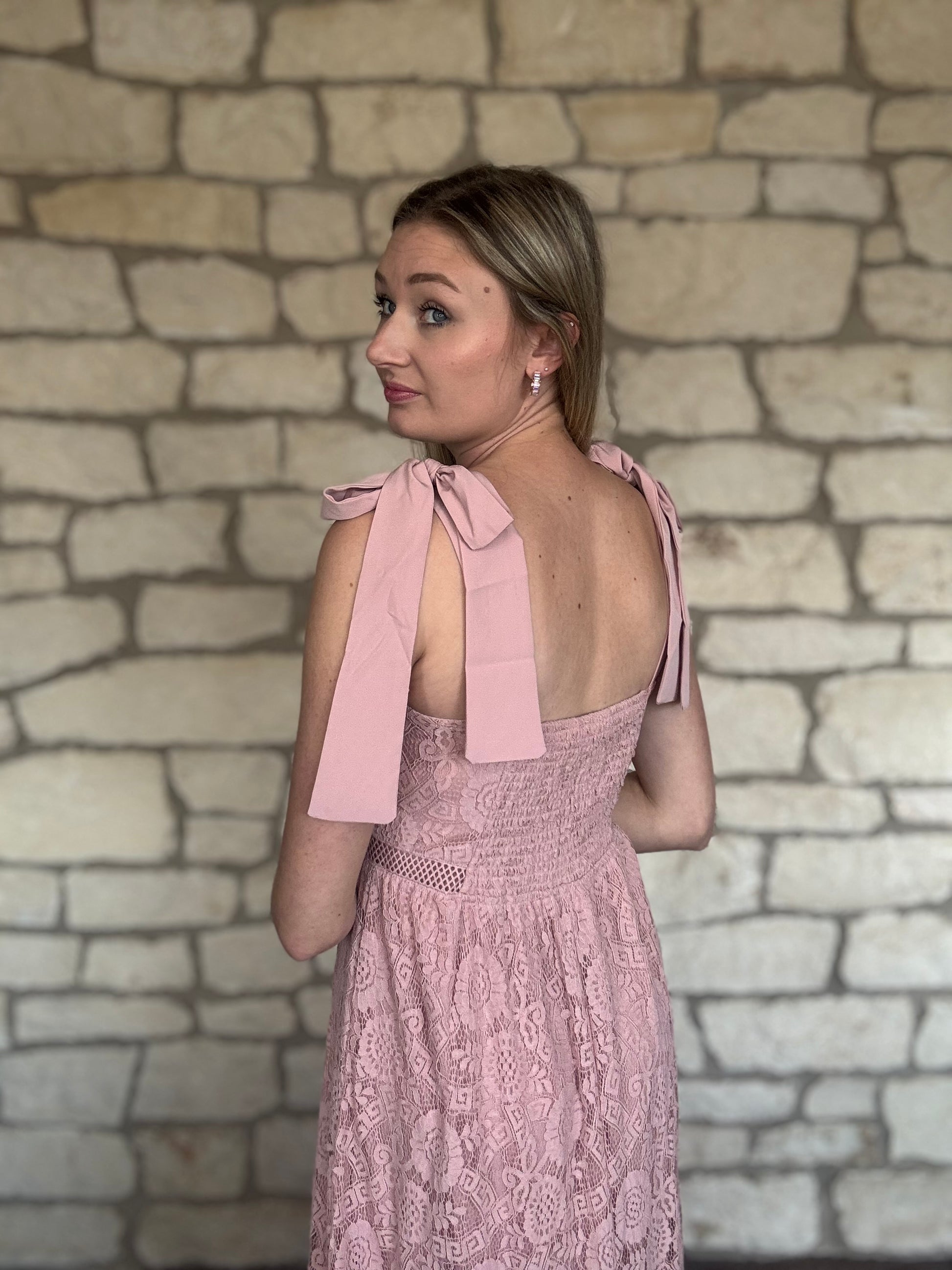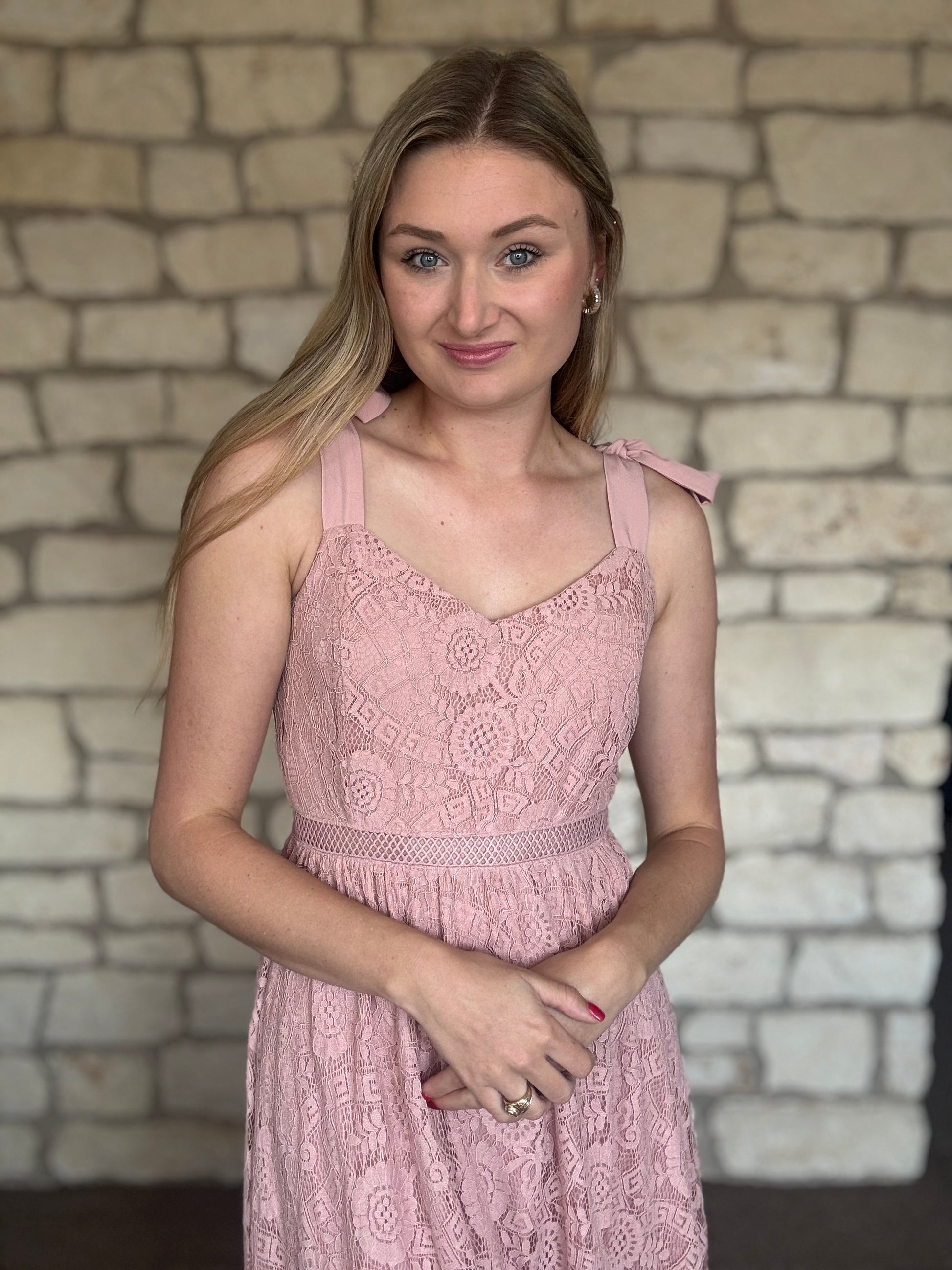 Slip into the whimsical Haley Dress and feel like a fairy princess. The mauve lace overlay adds a touch of ethereal elegance, while the tie straps provide a playful and adjustable fit. The scoop neck and lining ensure comfort and versatility.