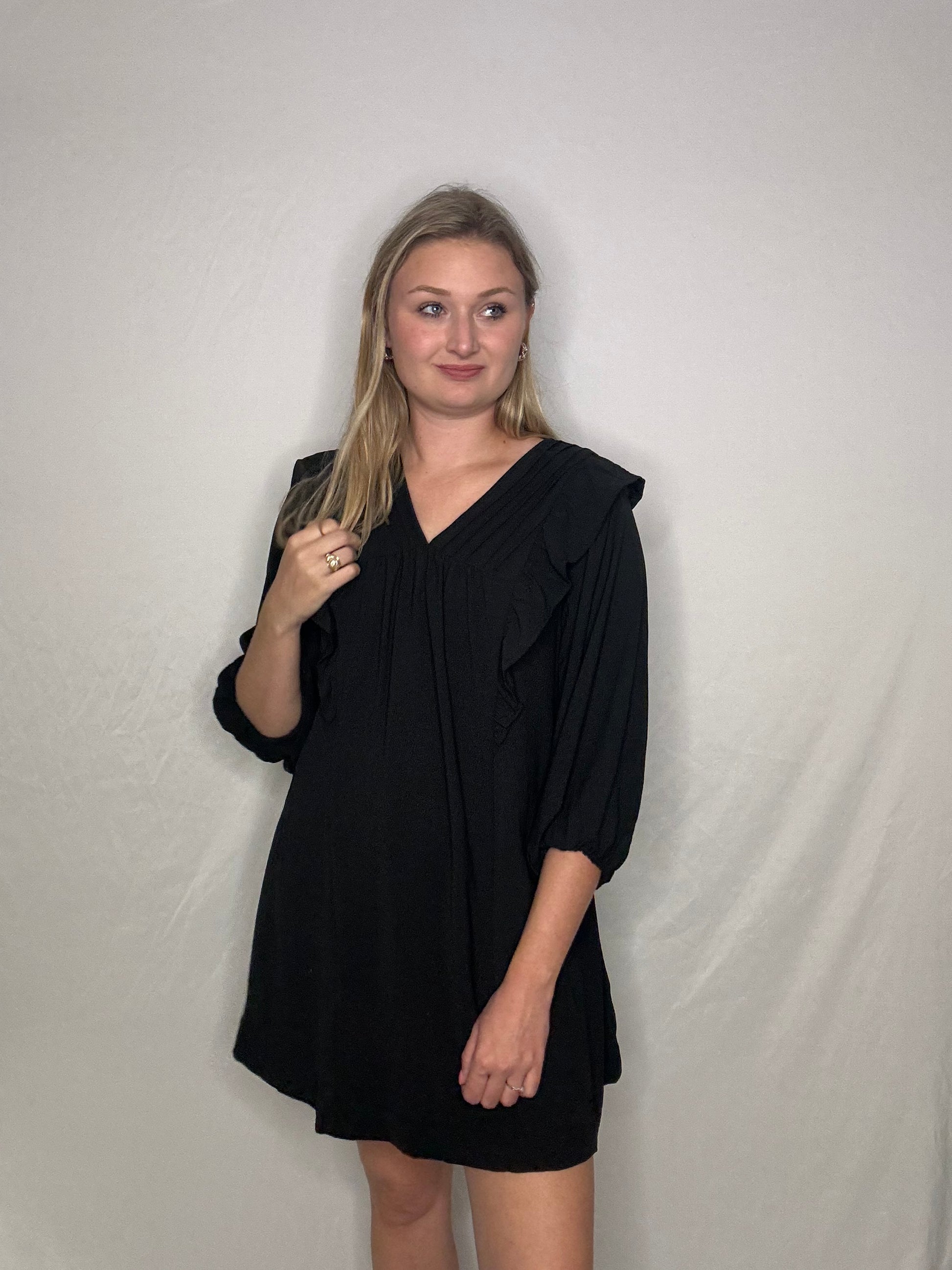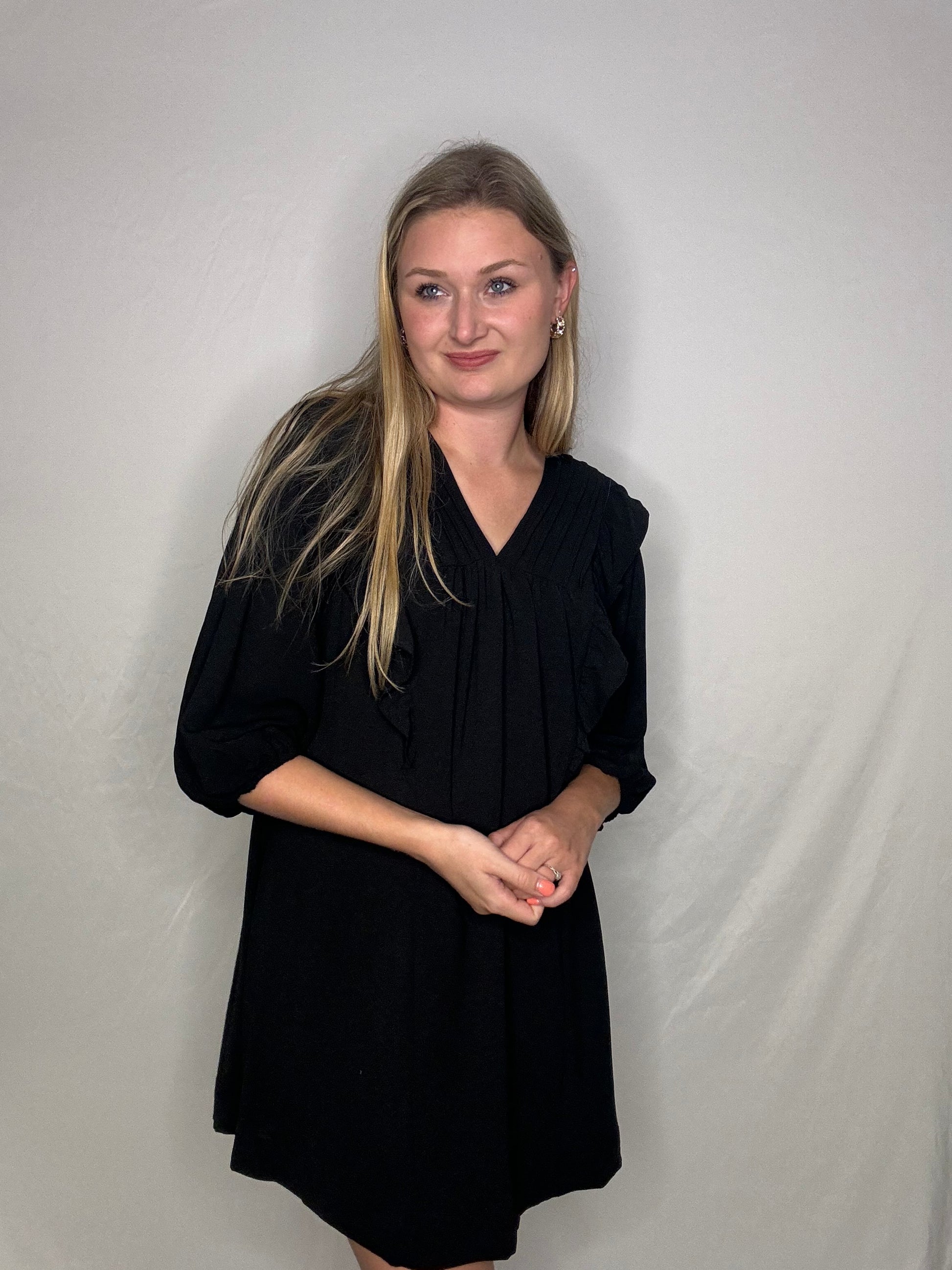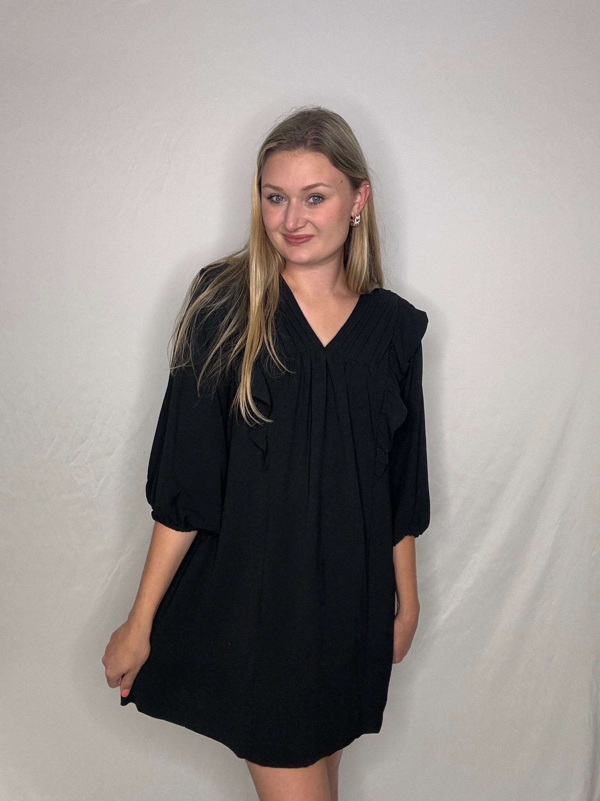 The Lily Dress is the perfect combination of sophistication and playfulness. With its 3/4 sleeve and black color, it's the ideal work dress. The ruffle front adds a touch of charm and femininity. Get ready to turn heads and make a statement at the office!