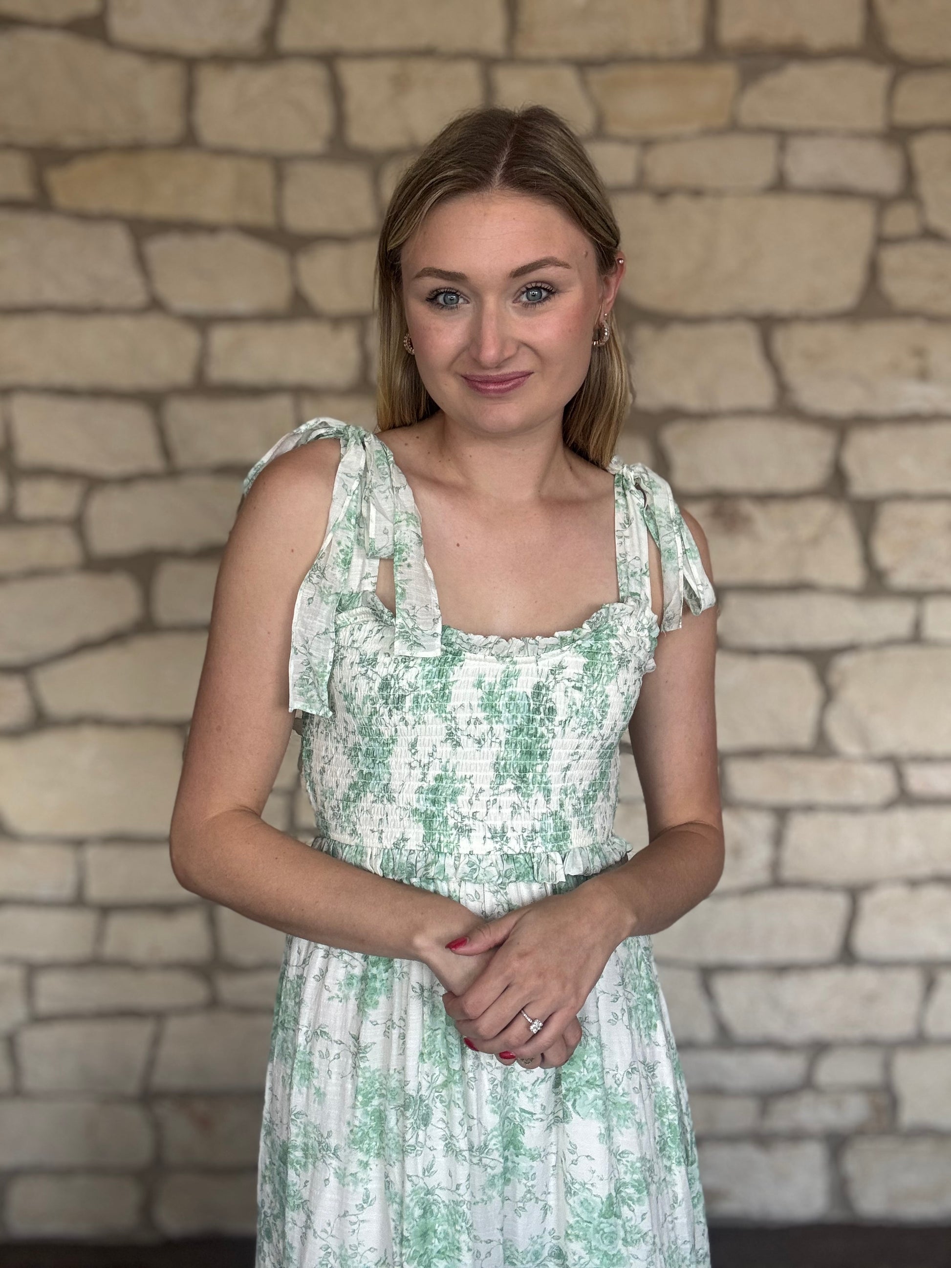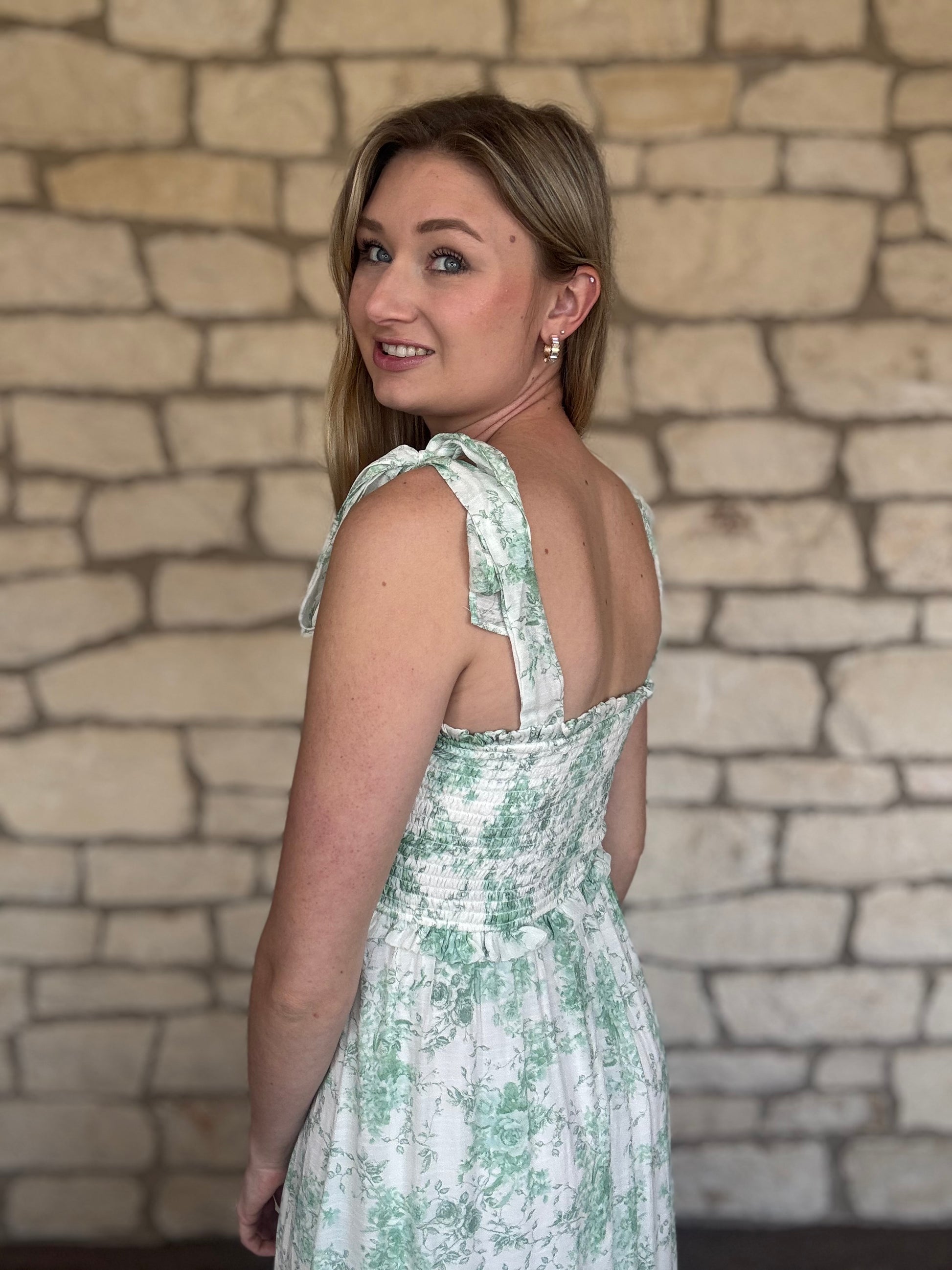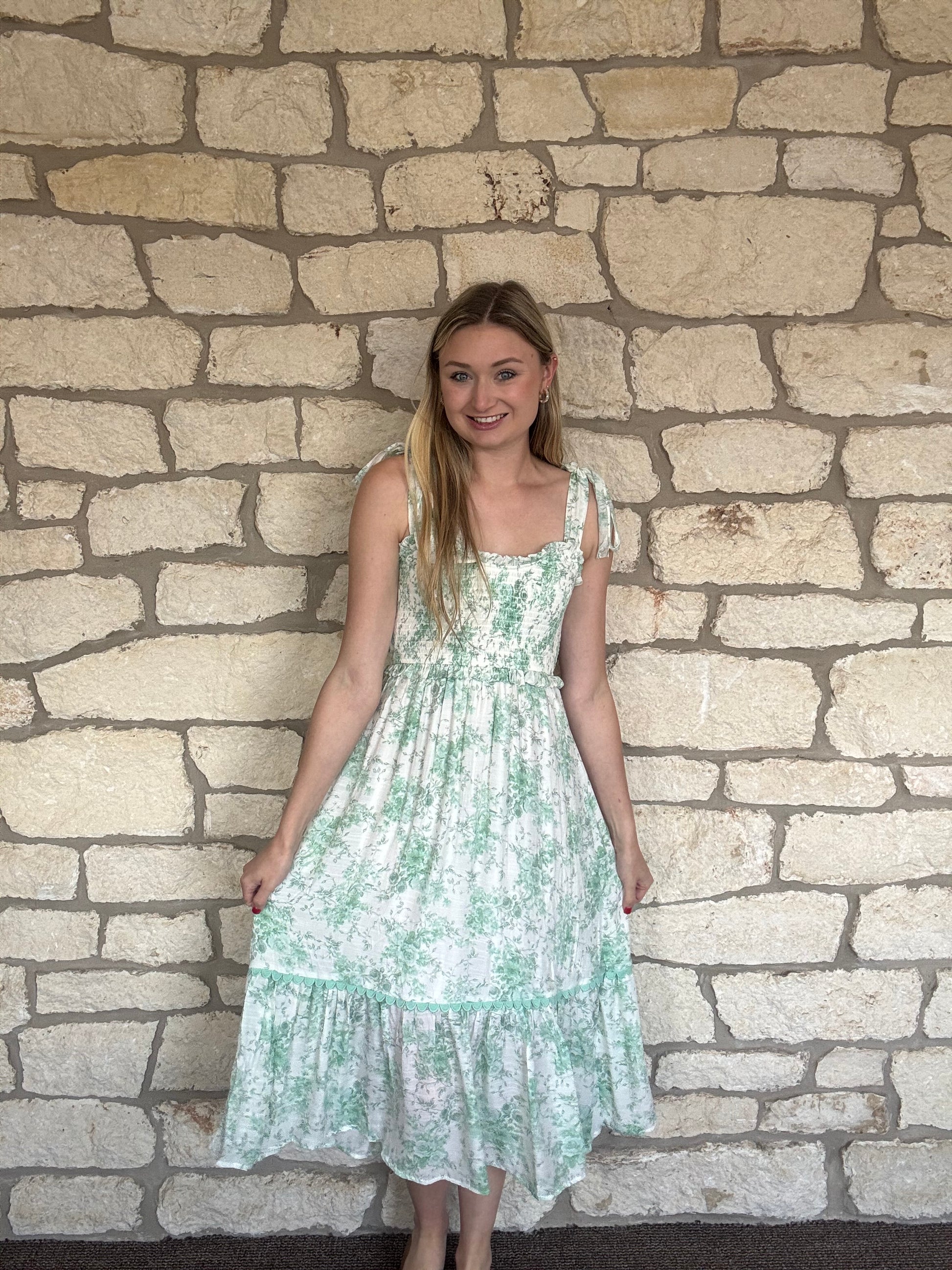 Get ready for a picnic with this playful Sage Picnic Dress! Featuring a scoop neck and fake tie top, it's the perfect maxi dress for a sunny day. Stay comfortable and stylish with its lined design.