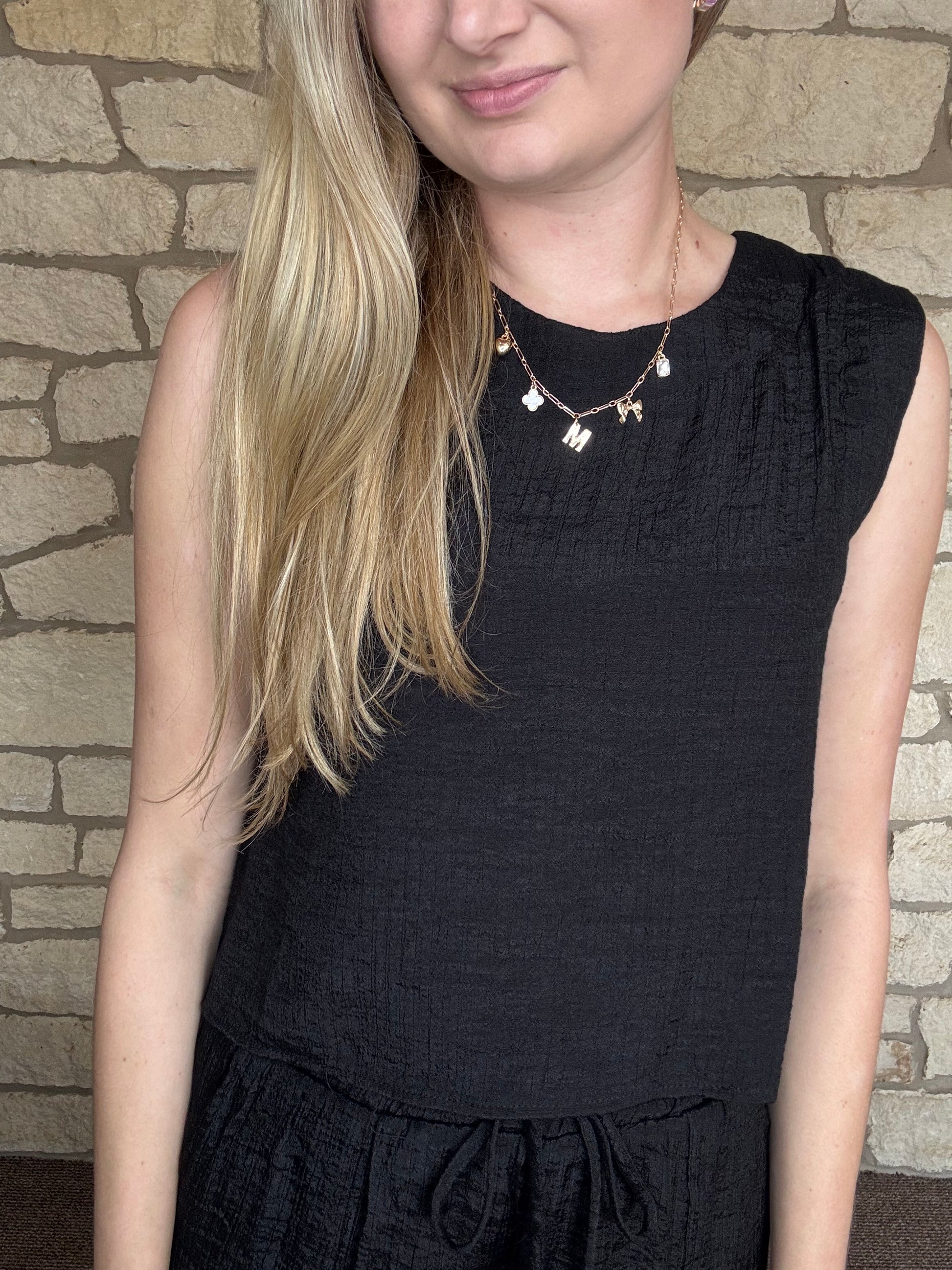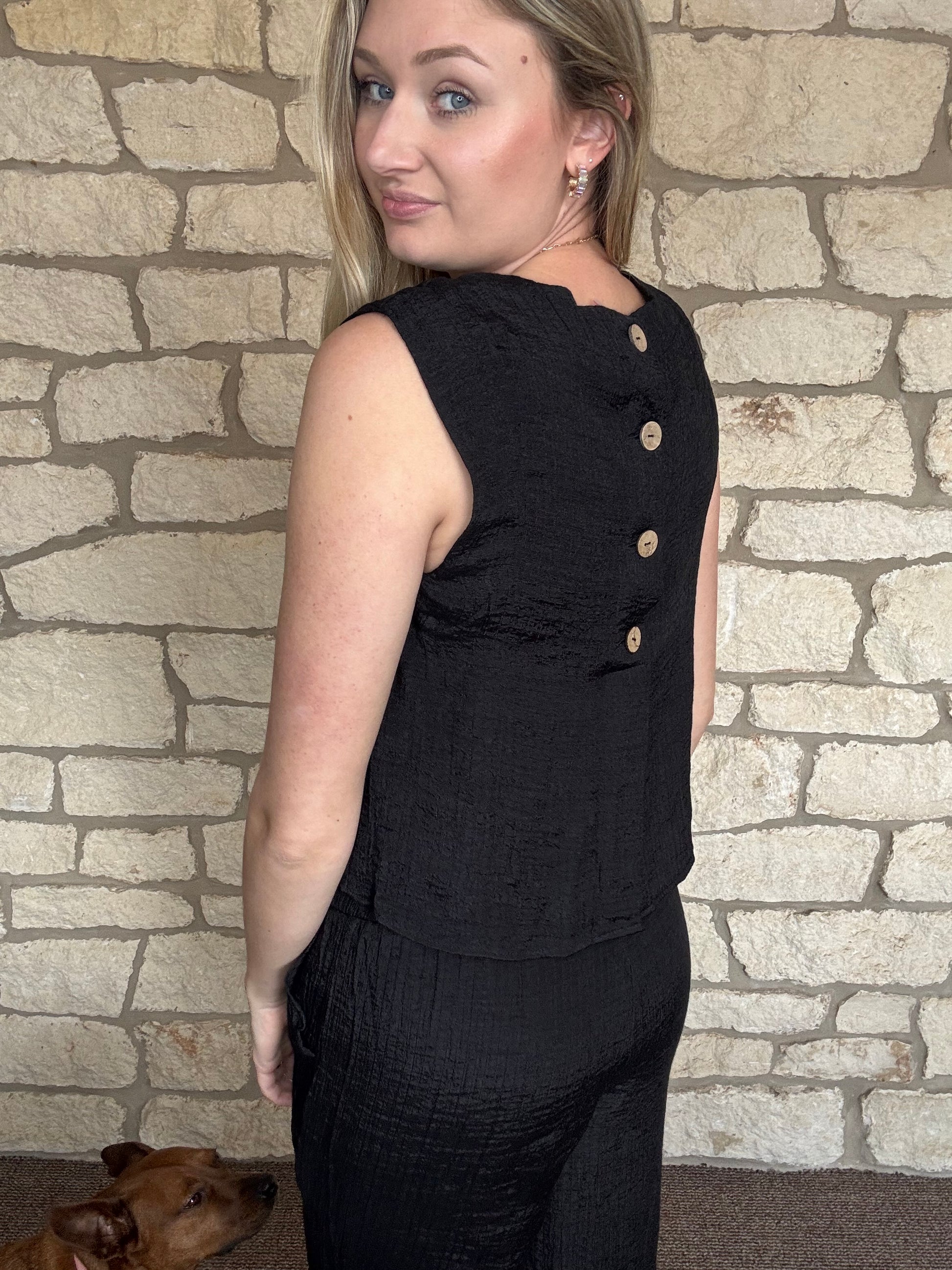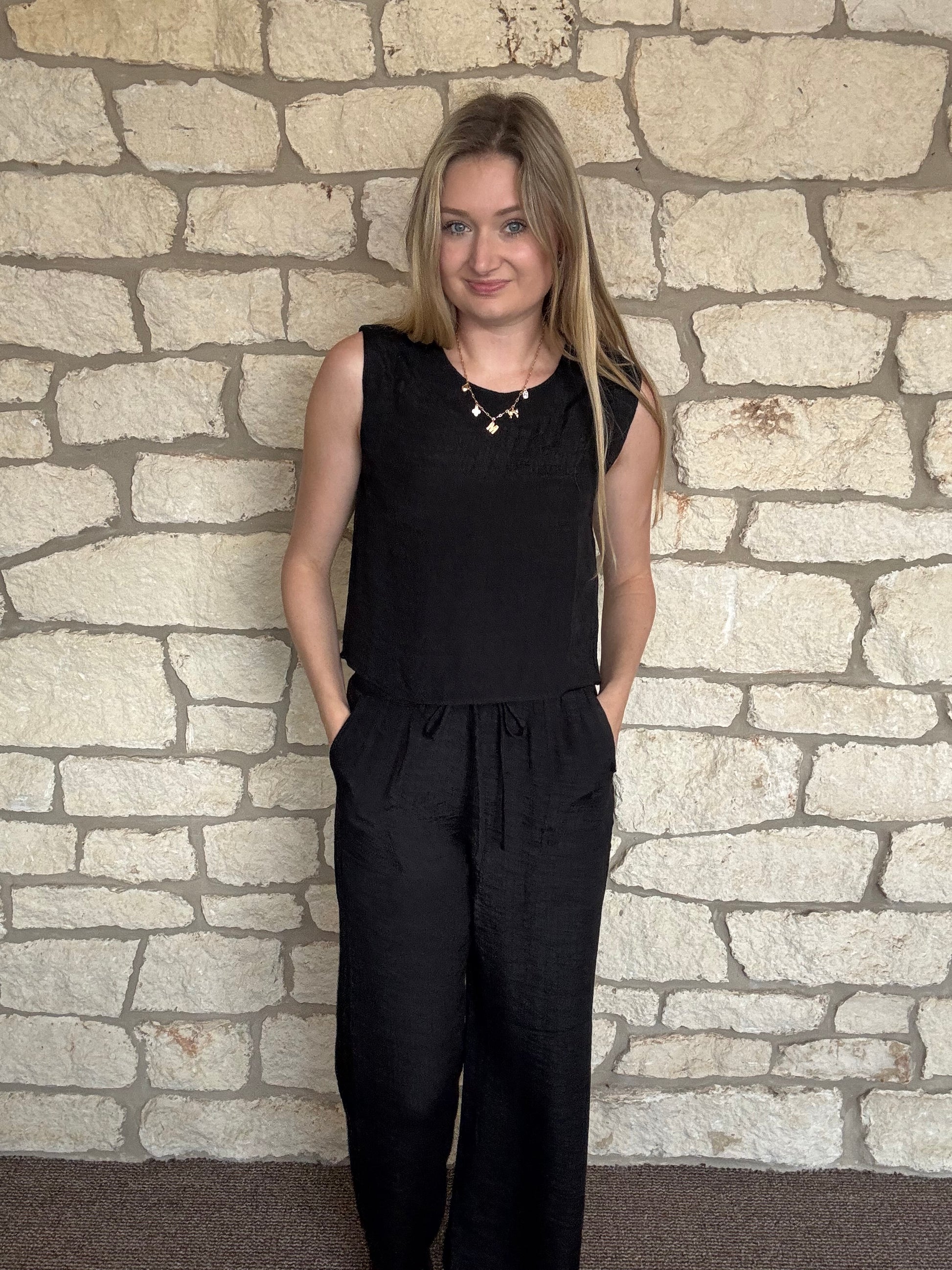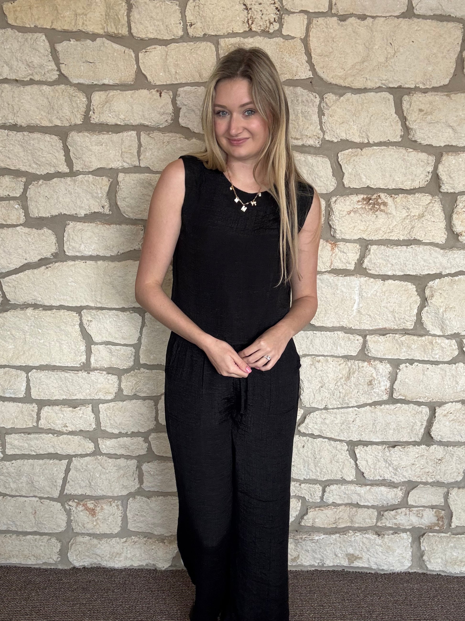 Unleash your sleek style with the Sleek Set! This stylish set includes a pair of black pants and a tank top, perfect for any occasion. Embrace your inner fashionista while staying comfortable and chic. (No need for stressing over outfit coordination!)
