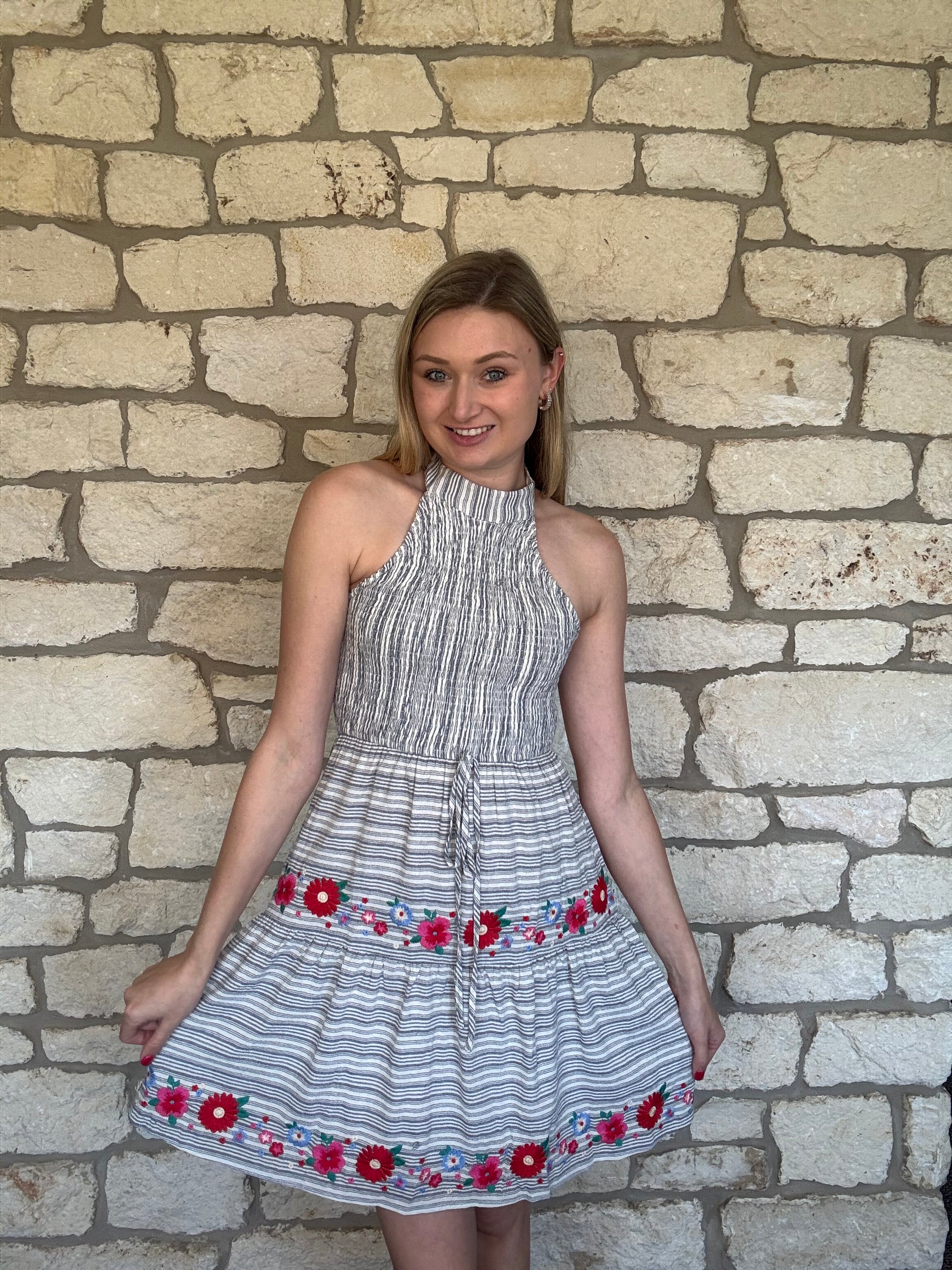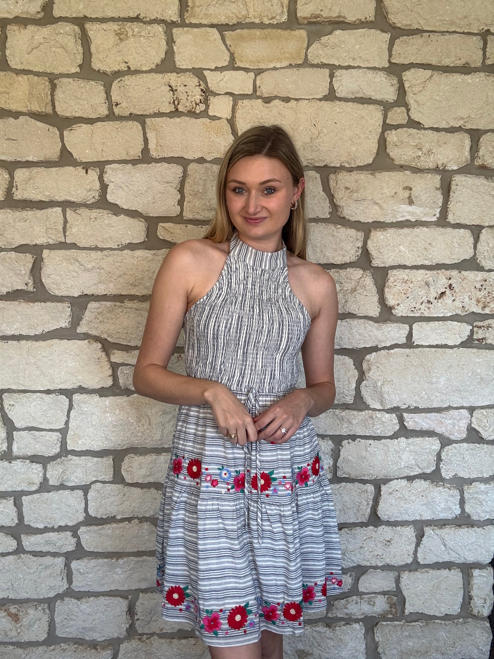The Tori Dress is a vision of versatility and charm, featuring a playful halter neck, stunning embroidered details, and a stretch top for a comfortable and flattering fit. The open back adds a touch of sexiness to this fun and flirty dress. Perfect for any occasion!