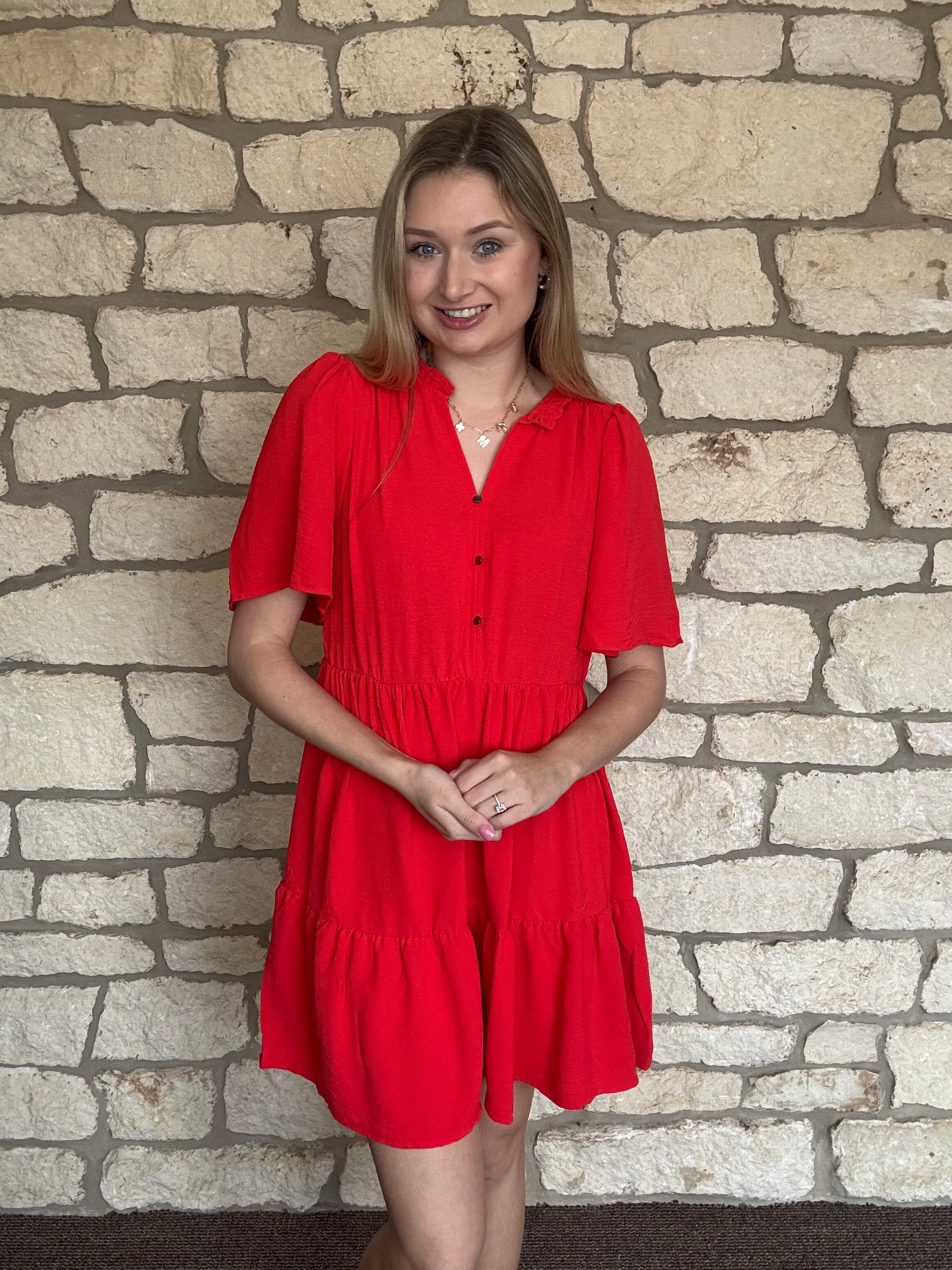 Get ready to turn heads in the Wrenly Dress. With its playful elbow length sleeves and flattering v neck, this mini dress is perfect for any occasion. In a vibrant dark coral color, you'll feel confident and stylish all day (and night) long!
